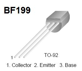 LET OP: In de versterker op de foto maak ik gebruik van een transistor met andere aansluiting dan de BF199. De BF199 moet als volgt aangesloten worden: