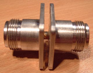 foto toont de benodigde onderdelen. Twee N-Connector chassisdelen met vierkante
