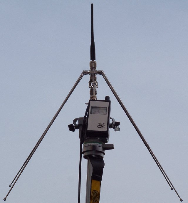 staan opgesteld op een driepoot statief om een portofoonantenne te meten.