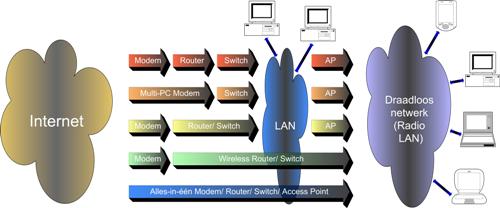 Het verkeer van en naar het Internet en tussen PC’s onderling, wordt geregeld door een router. Deze router verdient dus een centrale plaats in het netwerk. Aan de router komt aan de WAN (Wide Area Network) zijde een kabel of ADSL modem voor toegang tot Internet, en aan de LAN (Local Area Network) zijde één of meerdere Personal Computers en/ of randapparatuur. Een router heeft daartoe vaak een switch met meerdere aansluitingen ingebouwd. Om het netwerk te promoveren tot een draadloos netwerk, wordt op één van deze poorten een Wireless Access Point aangesloten. Via dit Access Point zijn meerdere computers draadloos met het netwerk te verbinden. In of bij de computer wordt naar keuze een bedraad of draadloos netwerk kaartje geplaatst, die kan communiceren met het basisstation. Hiervoor is keuze uit verschillende uitvoeringsvormen zoals CF, PCI, PCMCIA, USB of mini-PCI. Hierop wordt de netwerk kabel aangesloten, of de antenne in geval van een Radio LAN. Zo ontstaat een verbinding met het Internet en eventueel met de andere computers in het eigen netwerk.